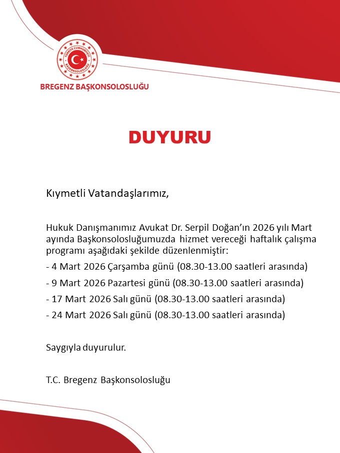 Vatandaş Kabul: 09:00 – 14:00 saatleri arasındadır. Konsolosluk işlemlerine ilişkin www.konsolosluk.gov.tr internet adresinden randevu alınması gerekmektedir.